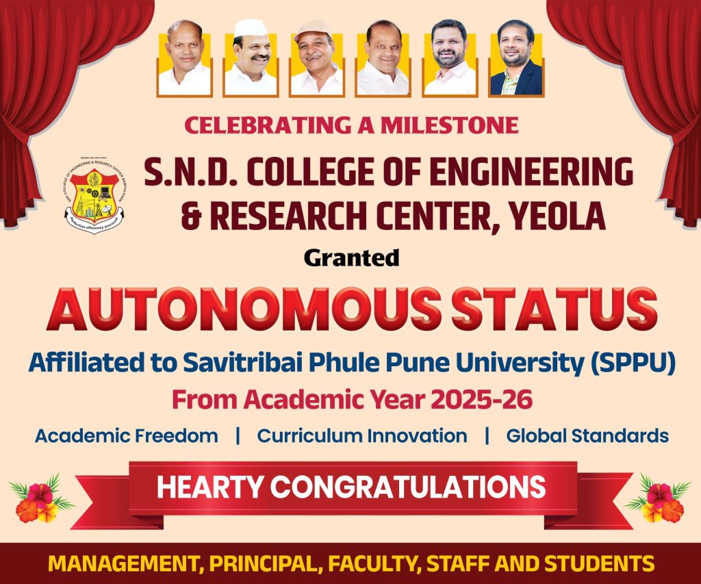 SND College of Engineering & Research Center, Babhulgaon, established in 2006-07, is located in Yeola, a Taluka in the Nasik district of Maharashtra. Spread across a scenic 150-acre campus, the institute provides a dynamic learning environment rooted in academic rigor, innovation, and real-world relevance. SND is dedicated to nurturing technical skills, leadership qualities, and values-driven professionalism.